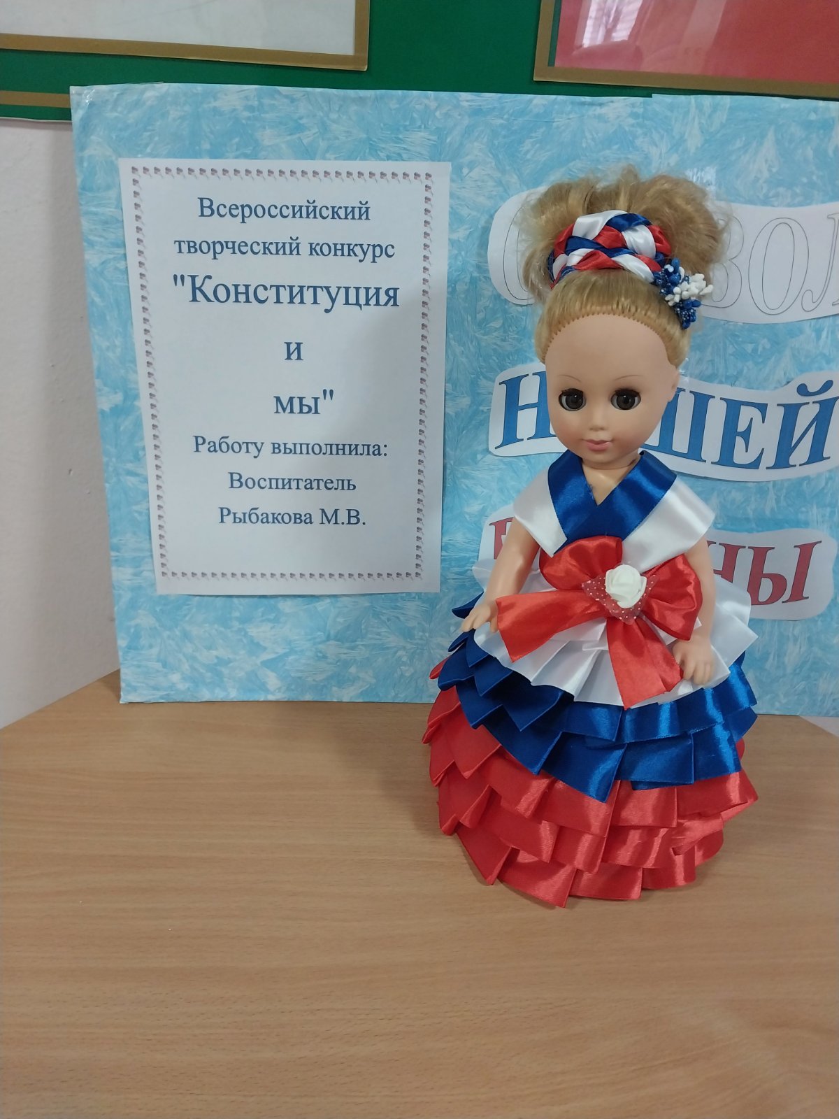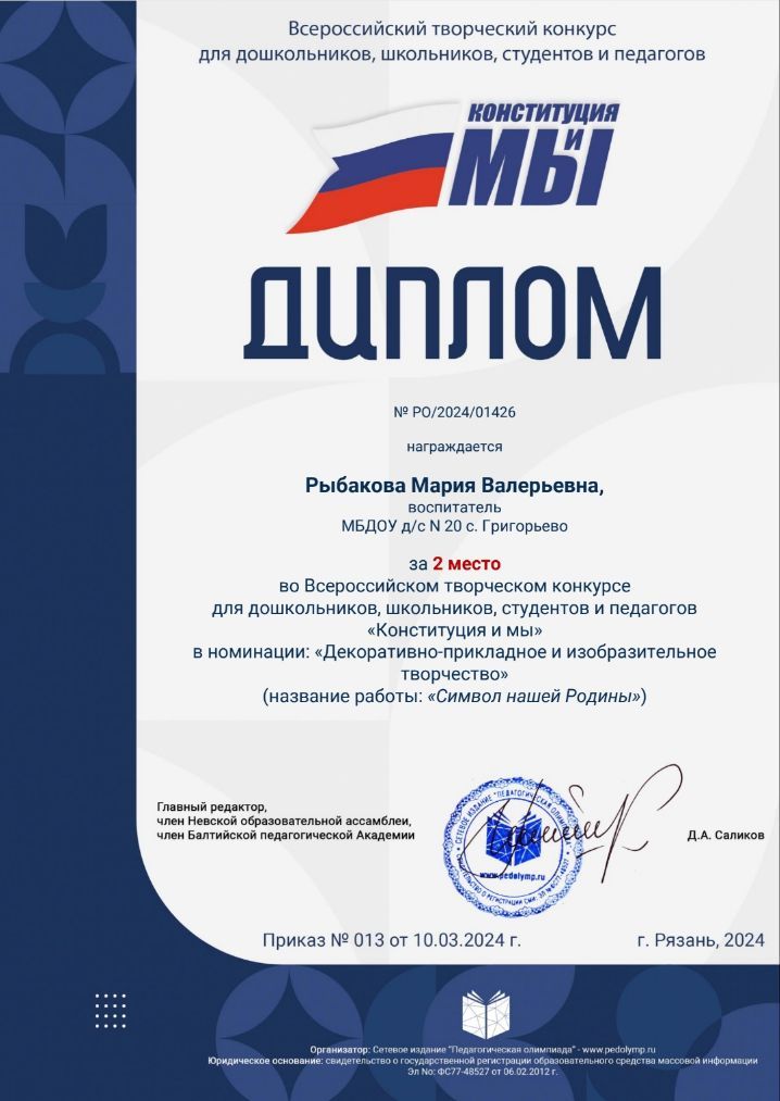 Педагог МБДОУ детский сад № 20 с. Григорьево Рыбакова Мария Валерьевна заняла почетное второе место во Всероссийском творческом конкурсе «Конституция и мы» в номинации «Декоративно-прикладное и изобразительное творчество».
